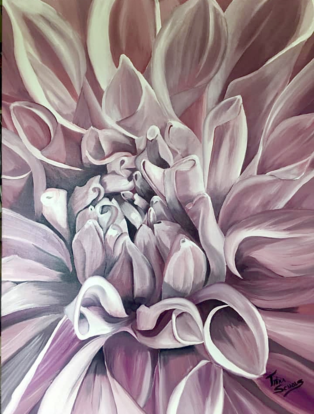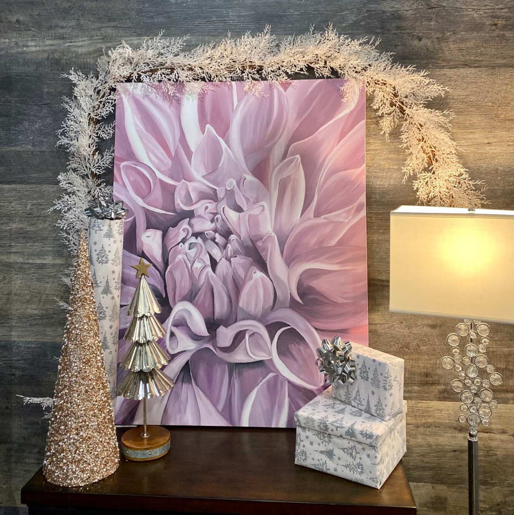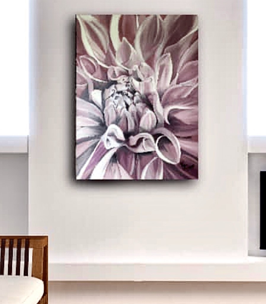 This is a large Oil on Cotton Canvas at 30×40”! Beautiful ‘Pink Petals’ is a close up of a Dahlia. On sale for only $500 (Canadian)